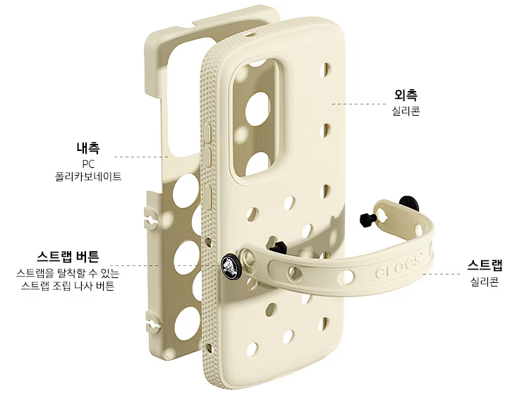 S25 크록스 케이스는 단순한 스마트폰 보호 액세서리가 아닙니다. 크록스 신발의 대표적인 디자인 요소인 펀칭 홀과 둥근 곡선형 외형을 그대로 반영해 독특한 비주얼을 제공합니다. 이로 인해 타 스마트폰 케이스와 차별화된 감성을 연출할 수 있습니다.